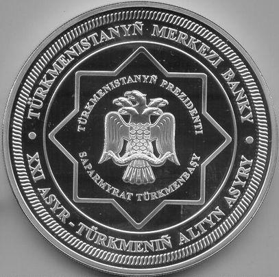 Личный герб Туркменбаши на туркменской монете: пятиголовый орёл держит в лапах двухголовую